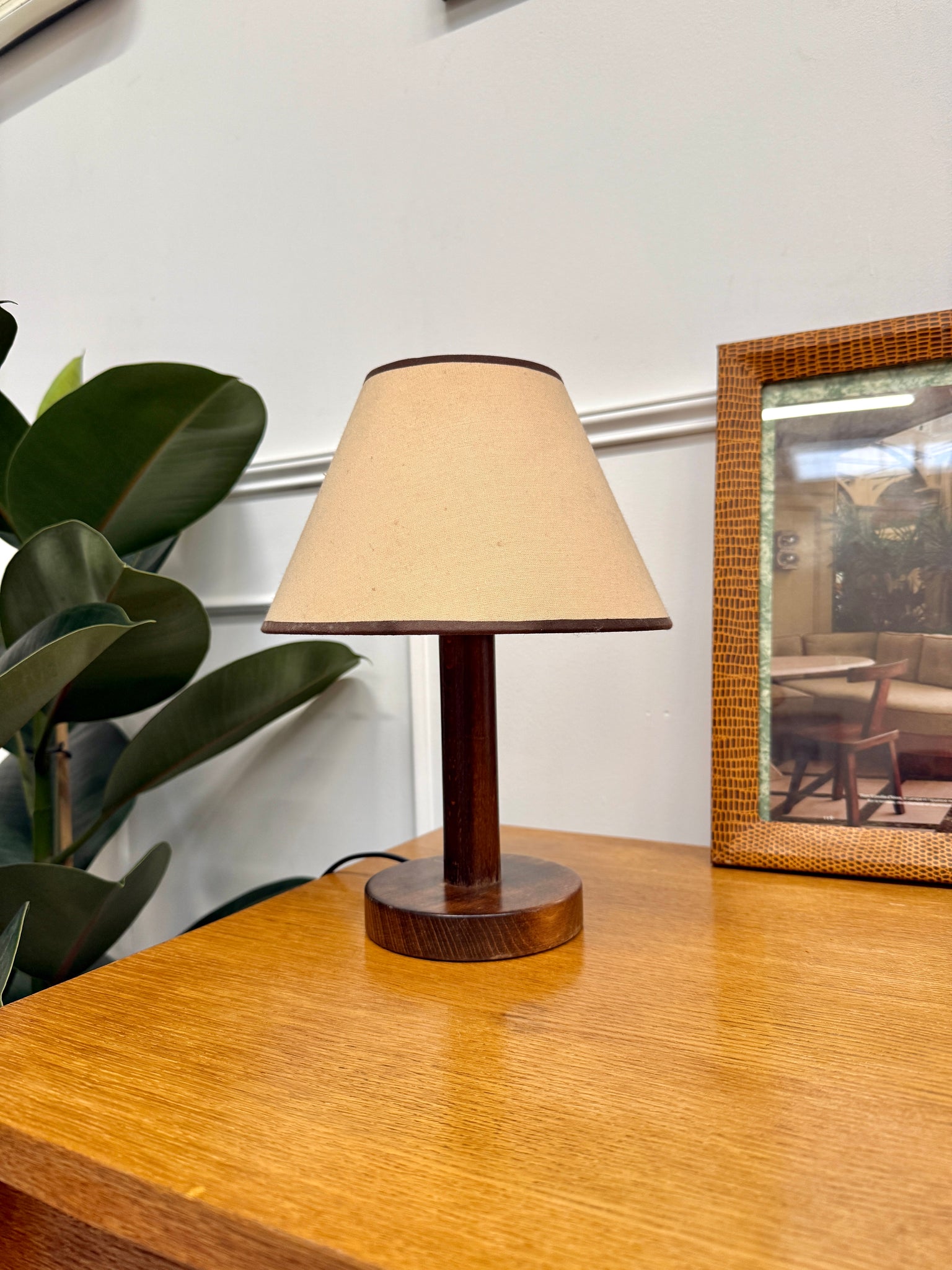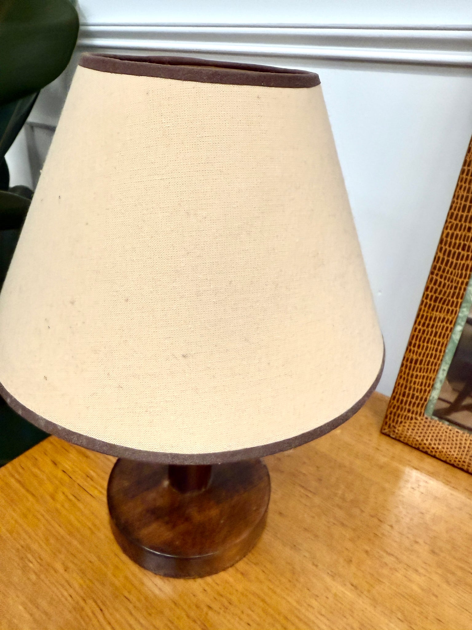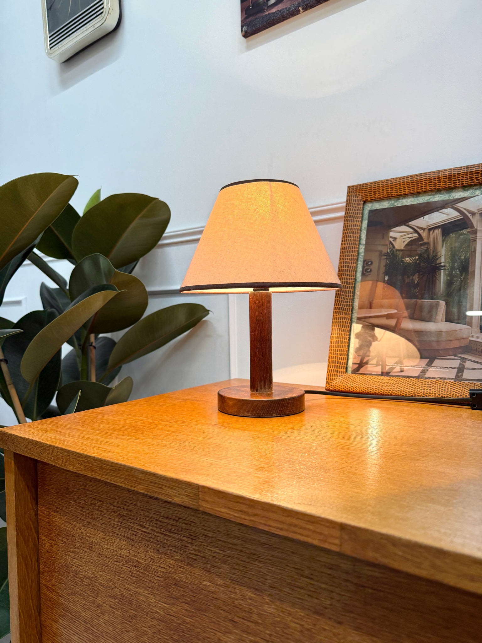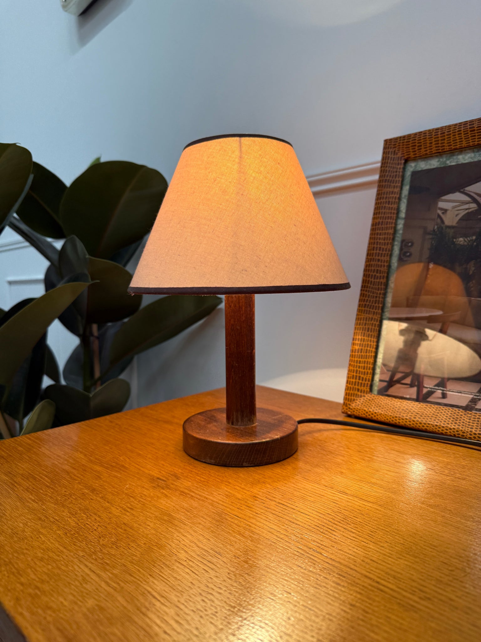 Lampe à poser en structure bois , abattant jour d’origine en tissu beige . Quelques traces de vie discrète sur l’abat-jour .