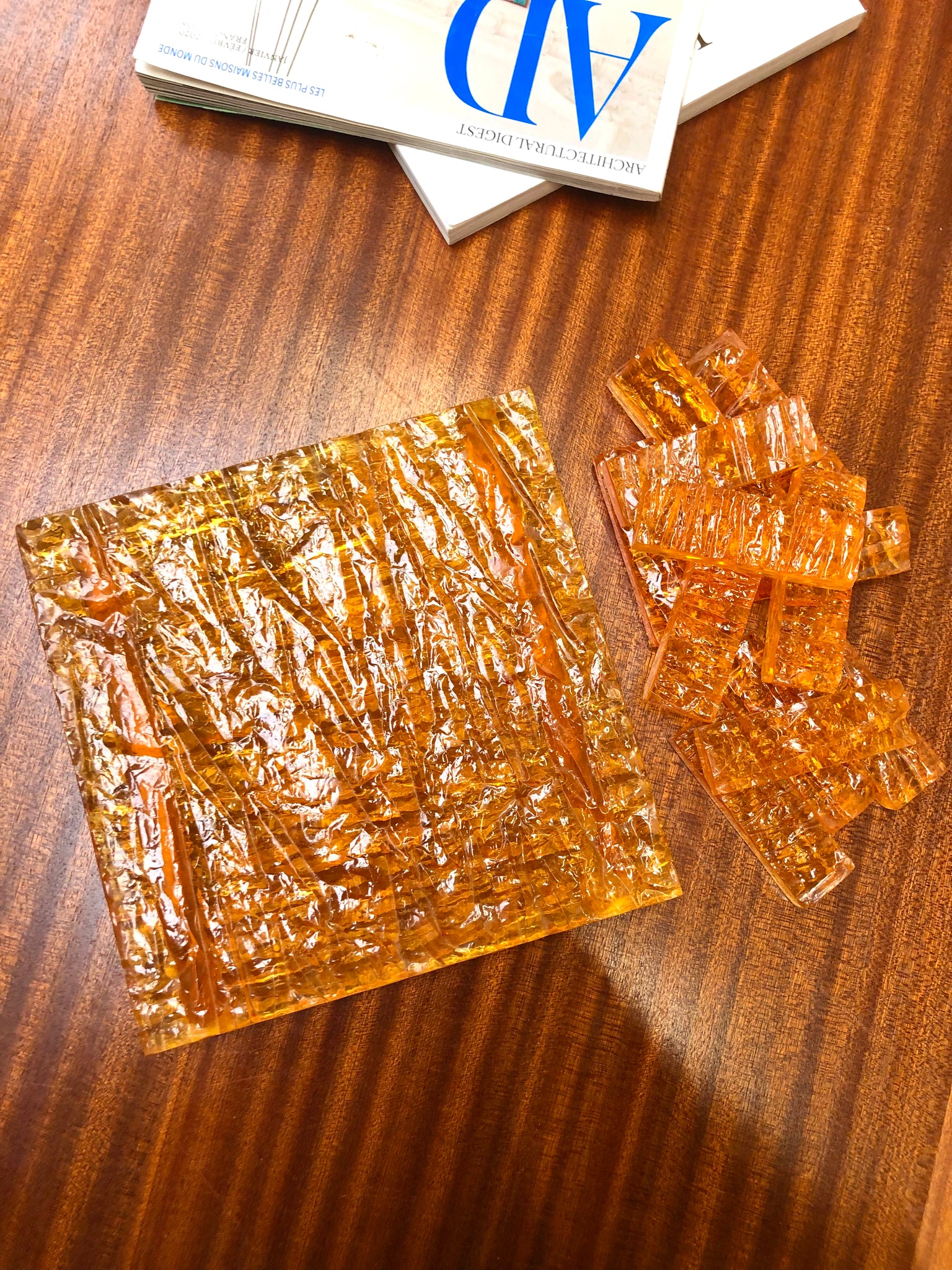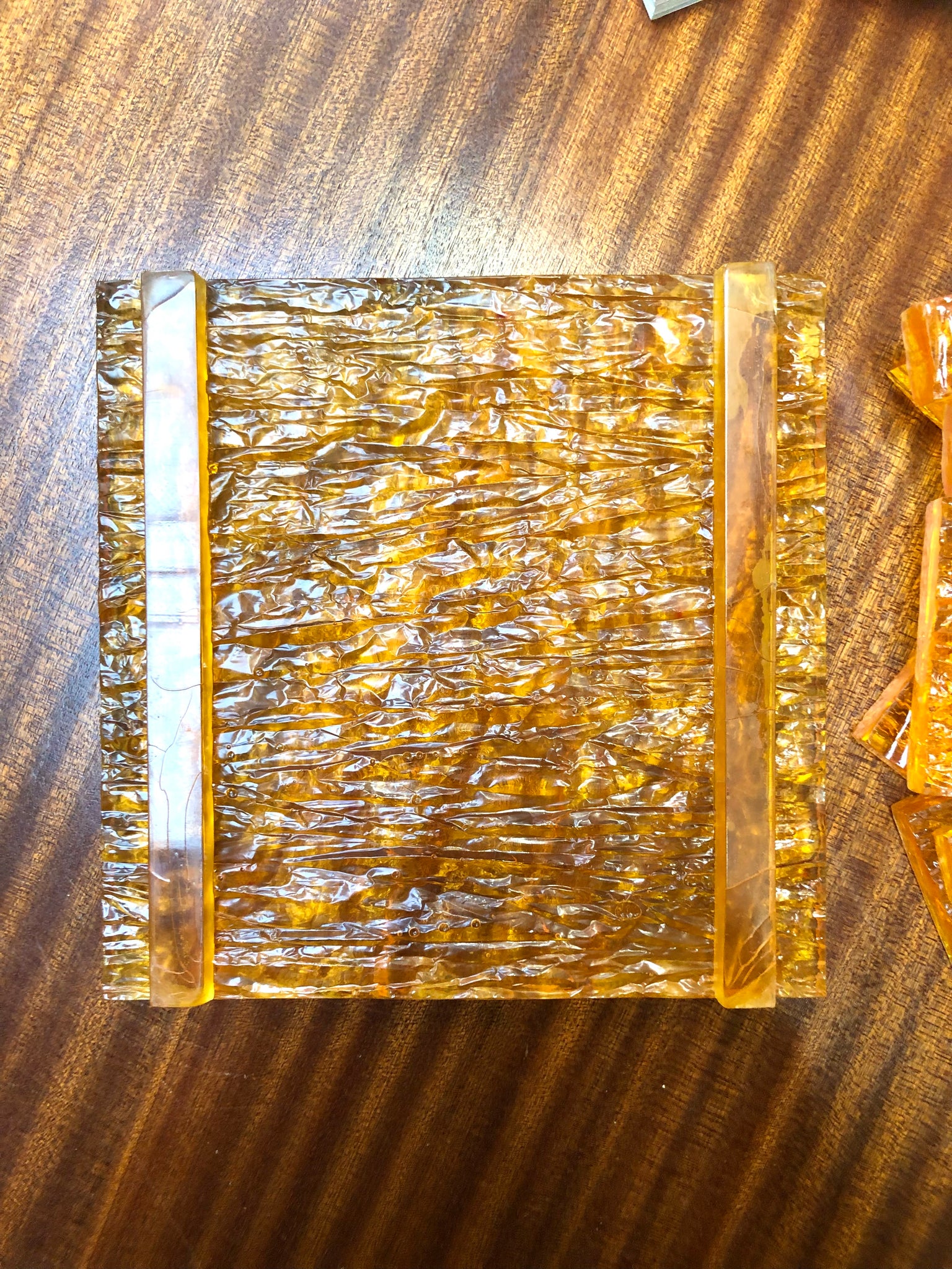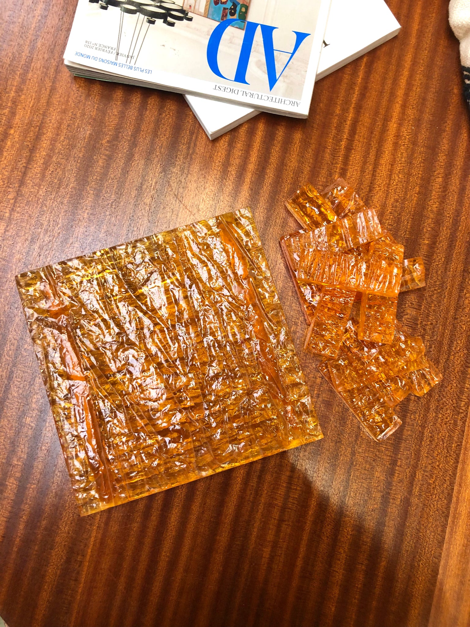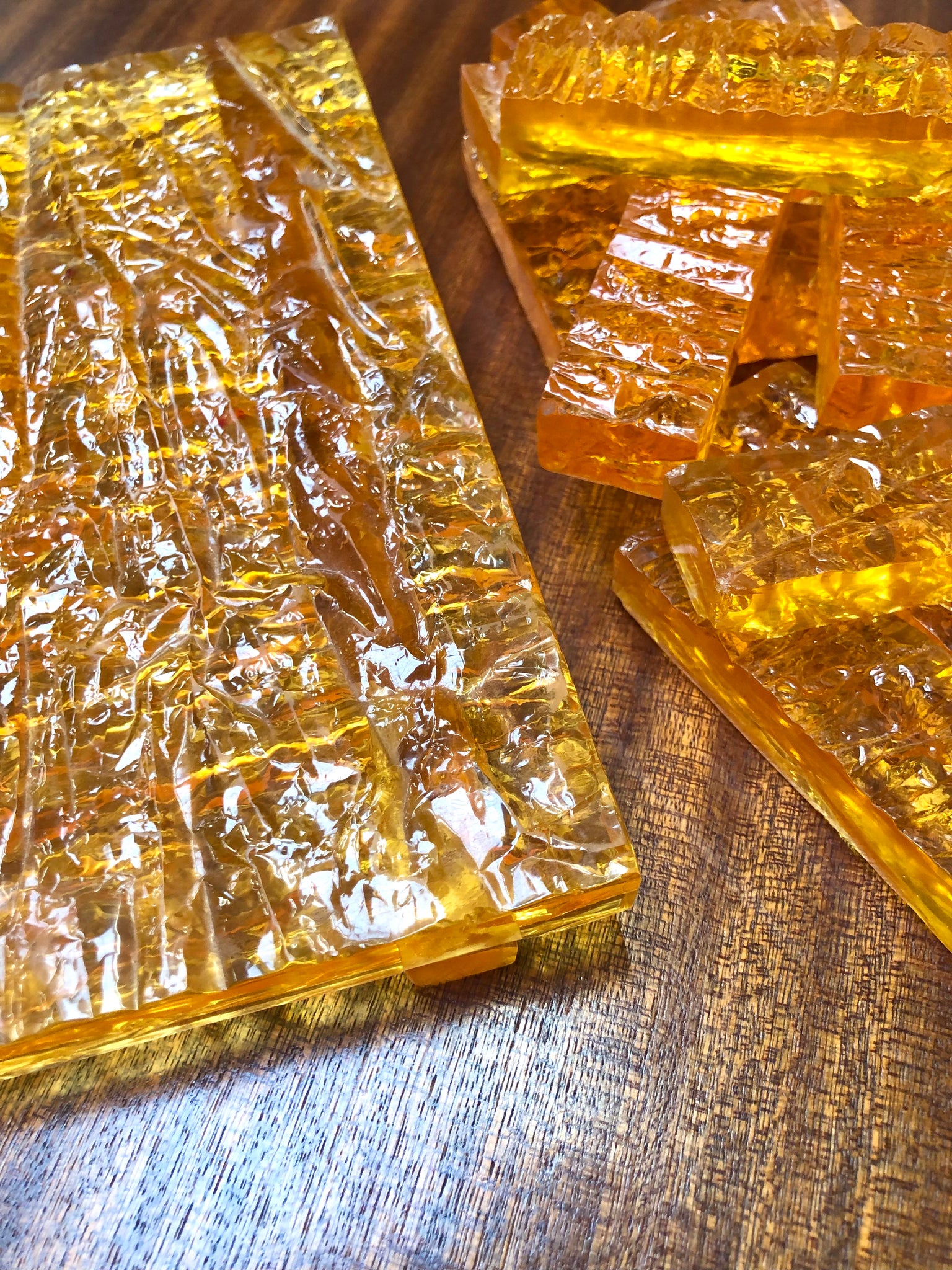 Ensemble vintage des années 70 en plexiglass ambré . Bel état, à noter tout de même que certains coins des repose-couverts sont ébréchés .