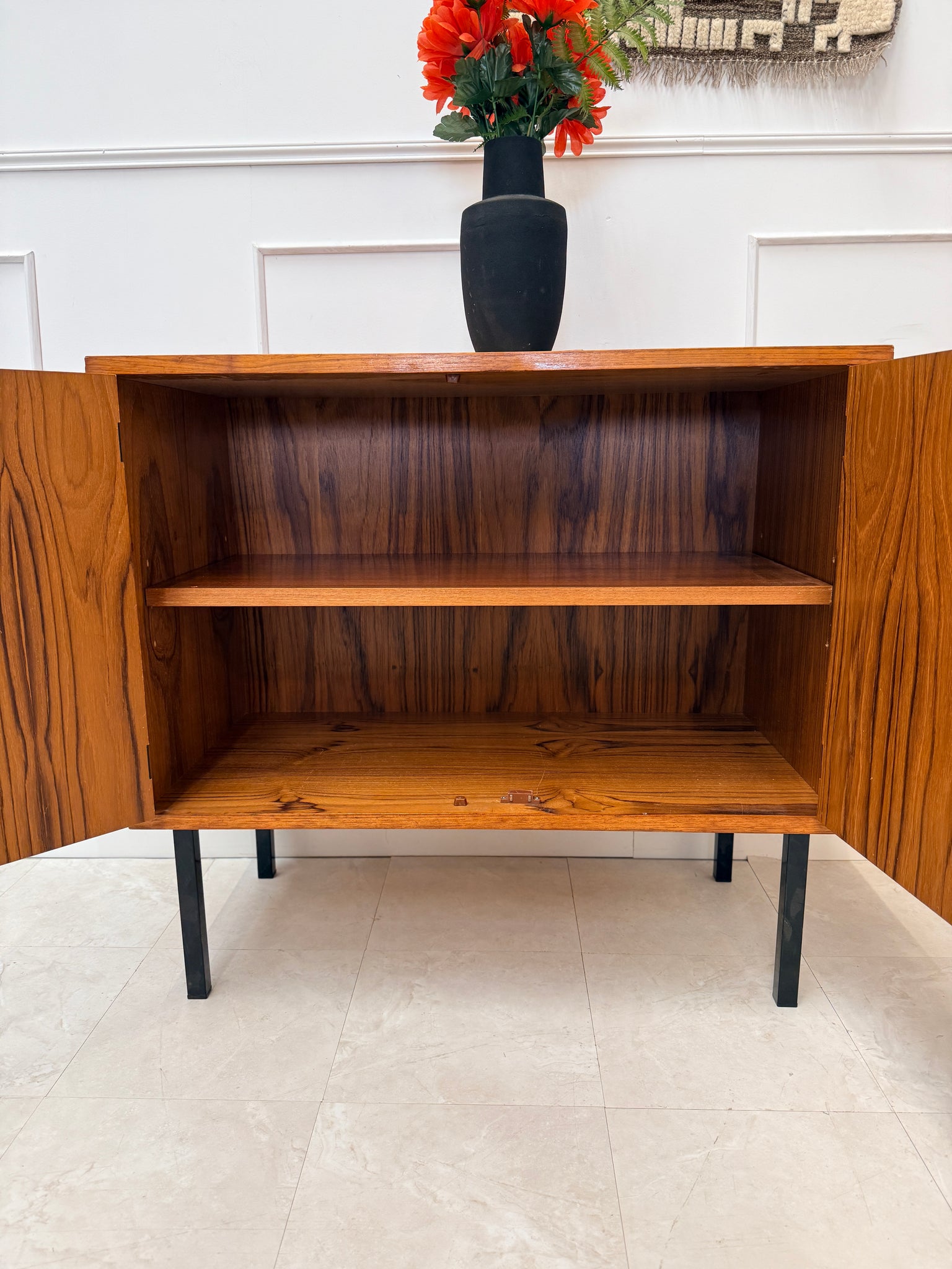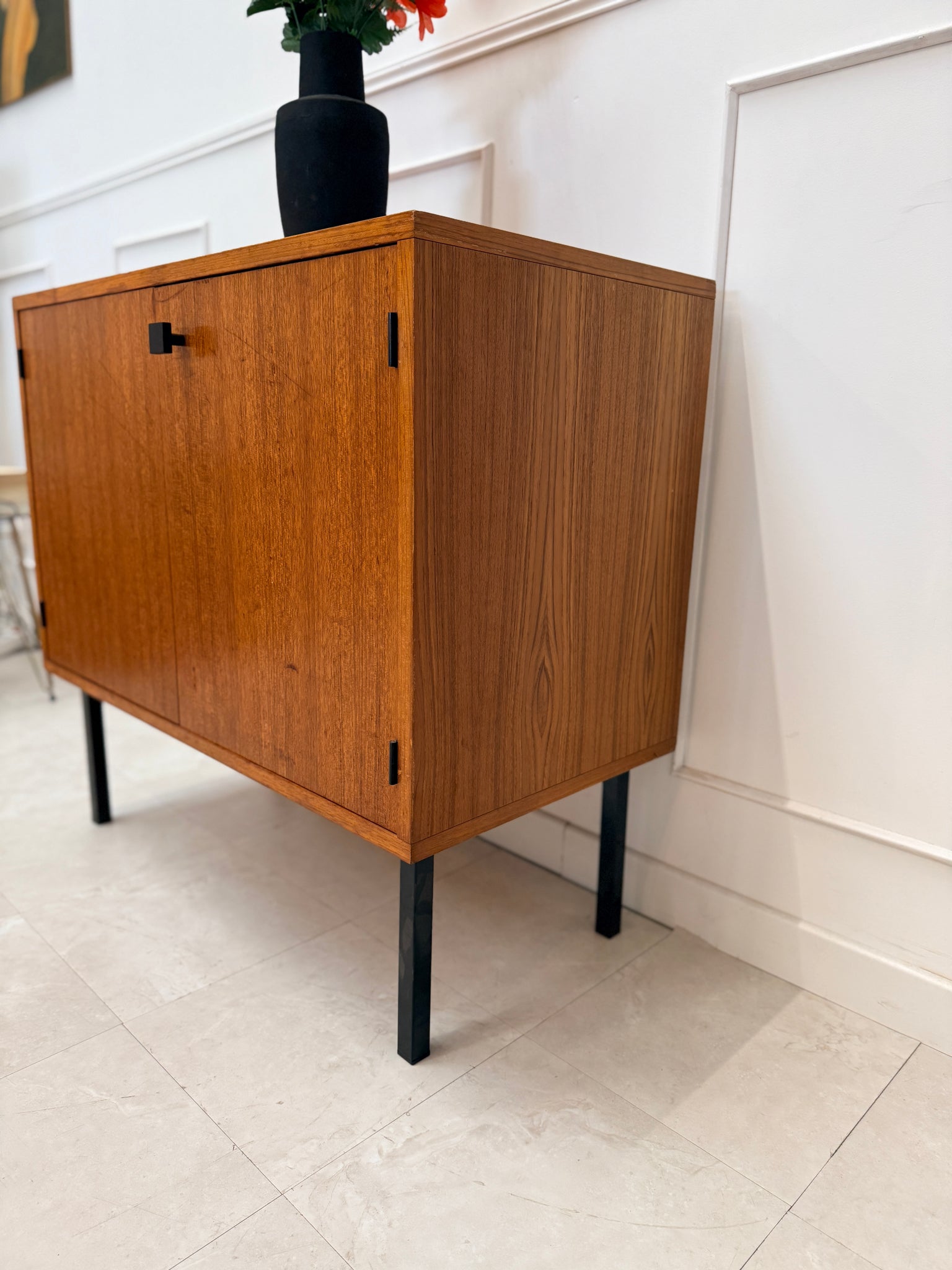 Buffet vintage 2 portes des années 60 , de style moderniste avec ses pieds en métal noir . Possède une étagère.