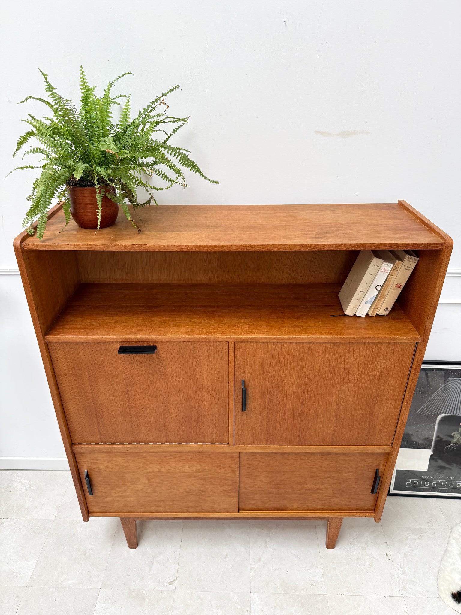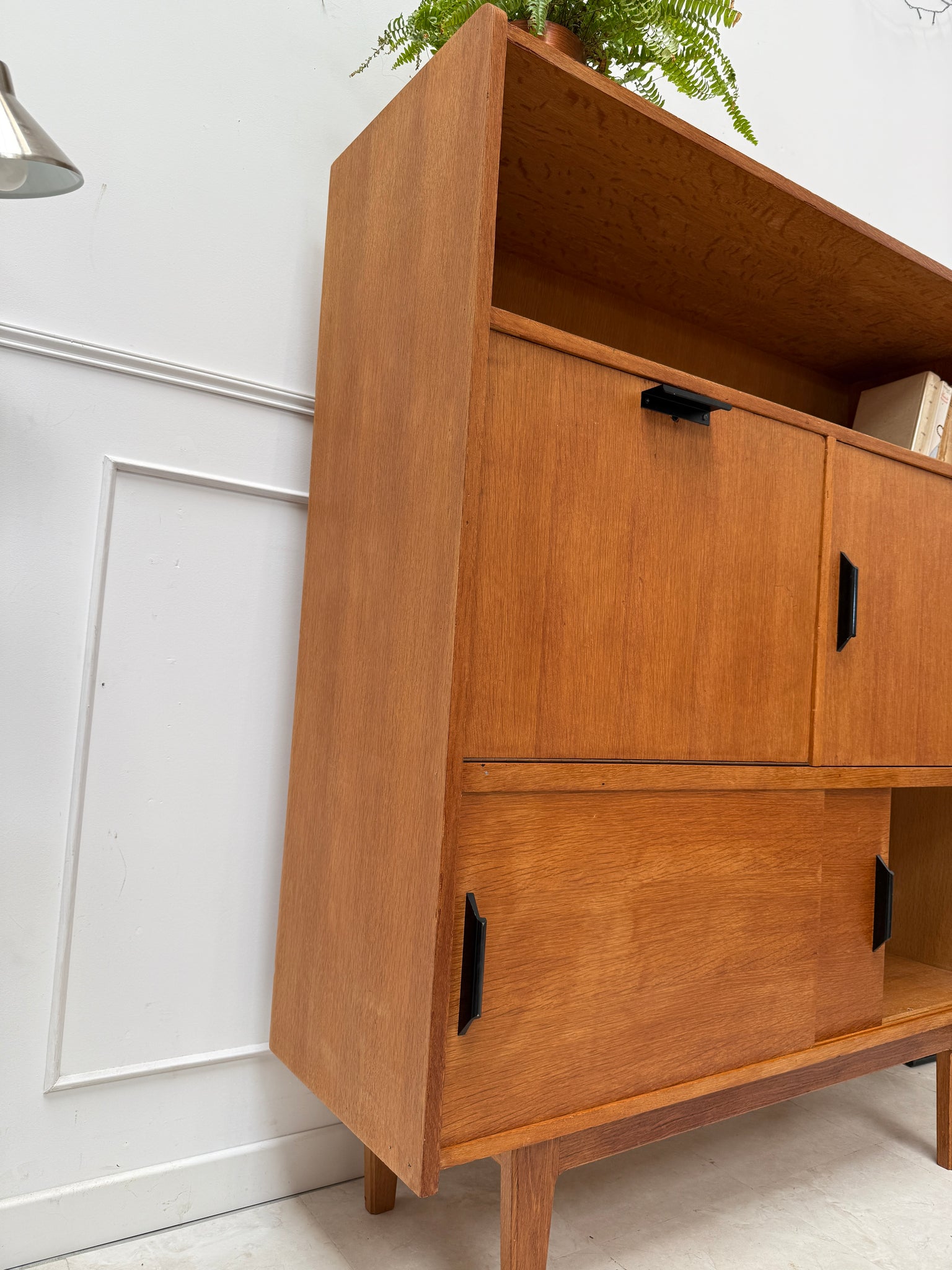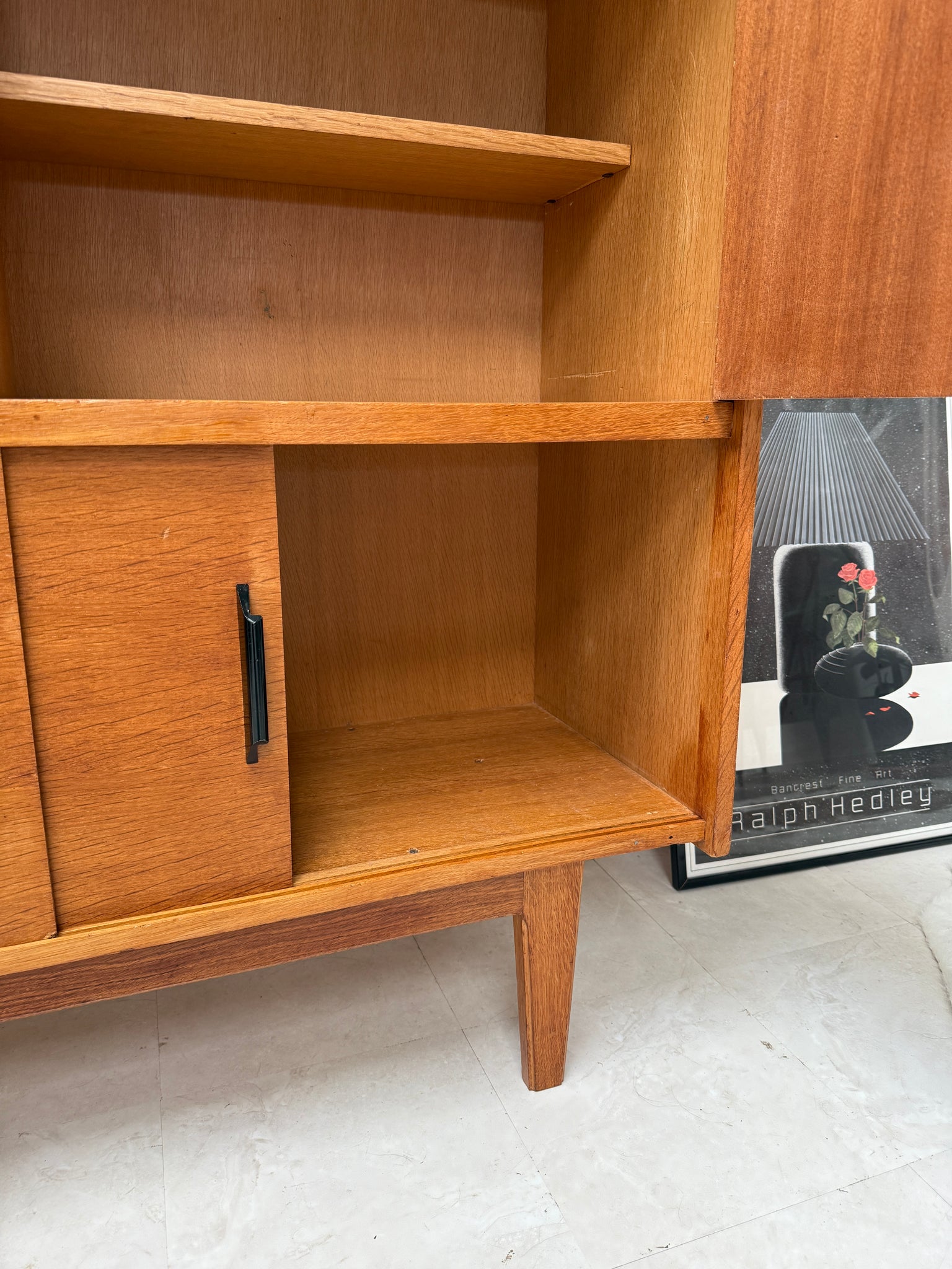 Buffet vintage scandinave des années 50 . Possède différents typologies de rangement : 1 meuble bar , un grand placard portes coulissantes , un grand casier et un placard fermé.