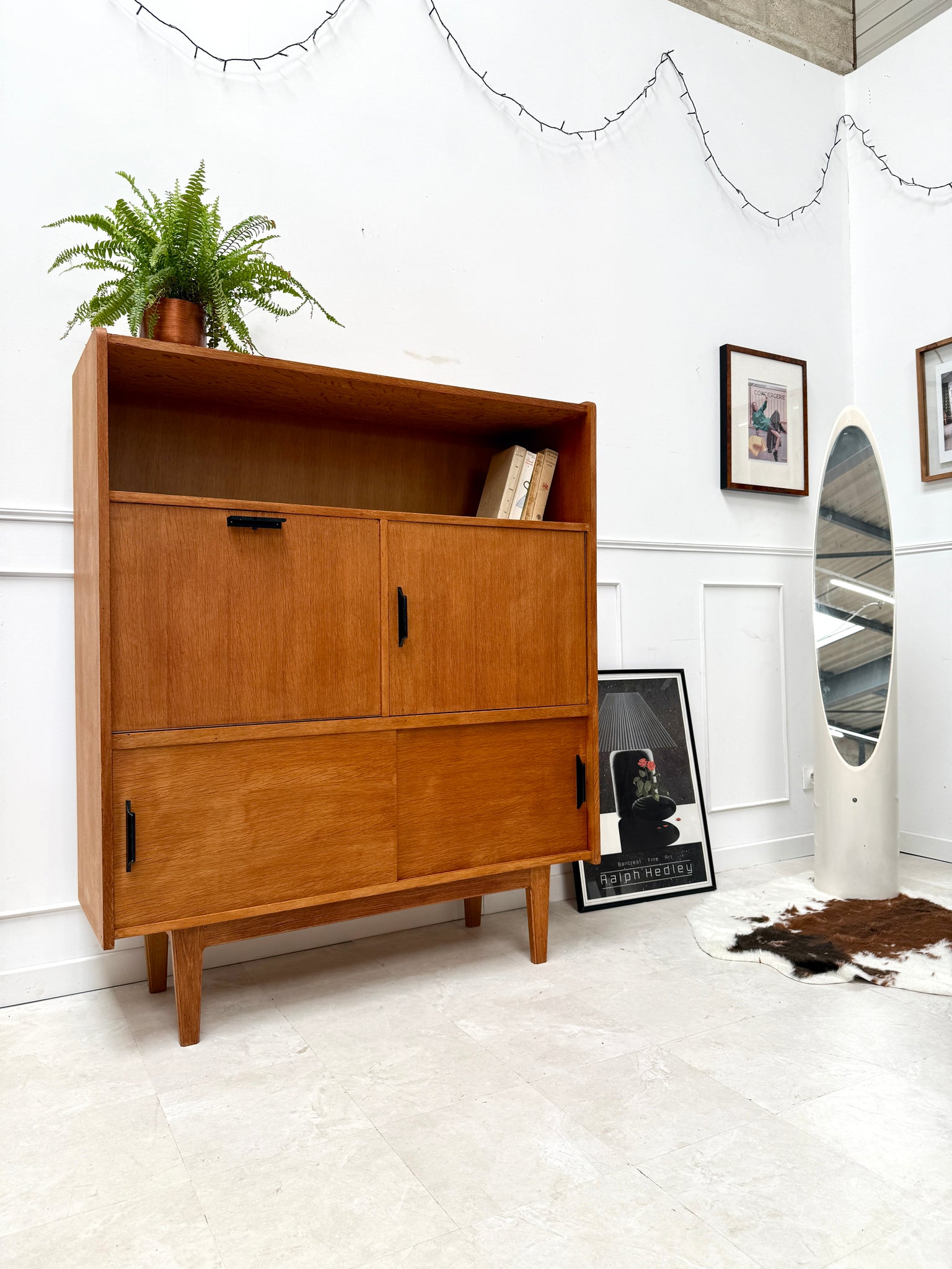 Poignées en métal noir , placage chêne doré. Buffet en très bel état quelques traces de vie discrètes .