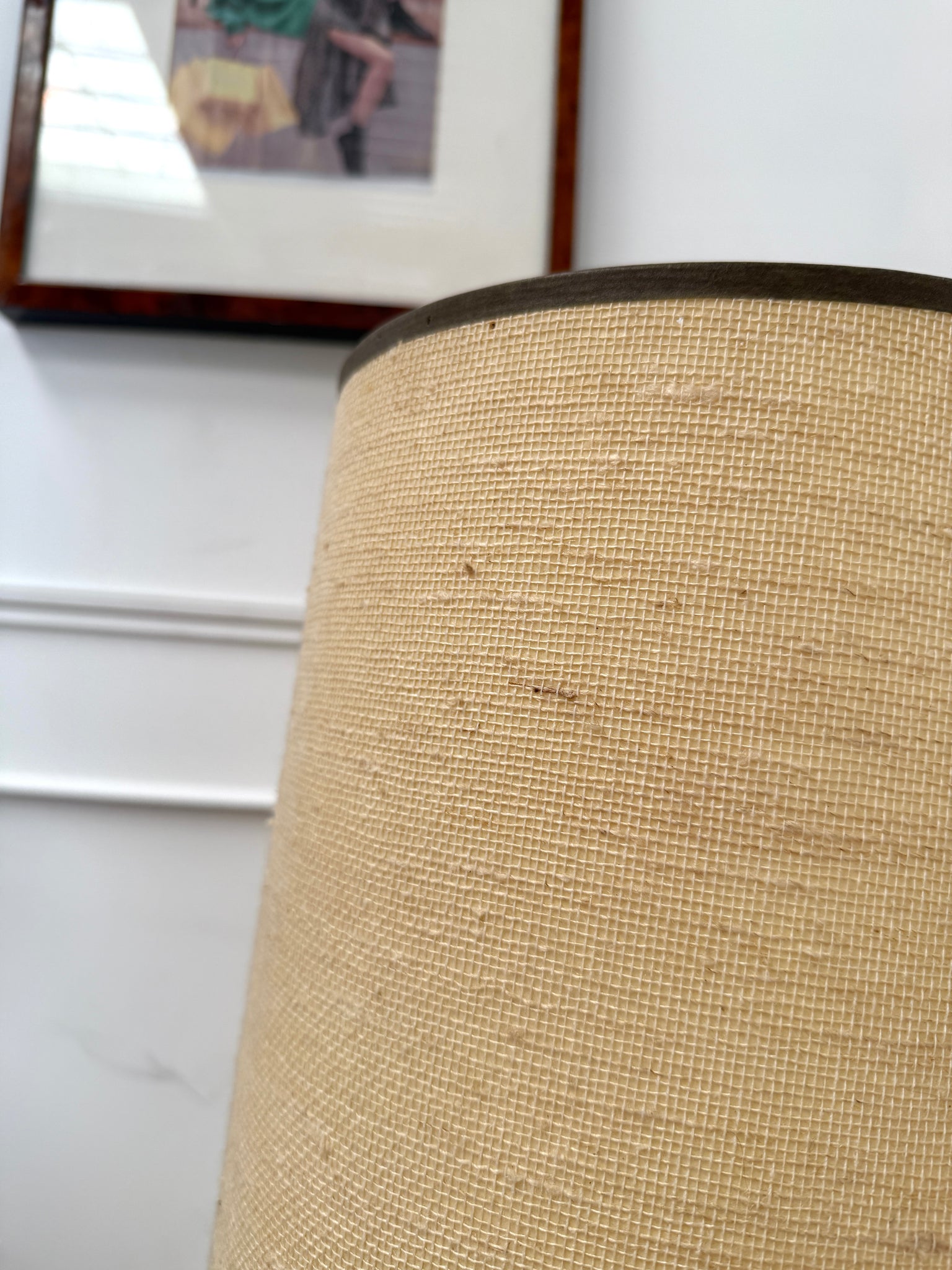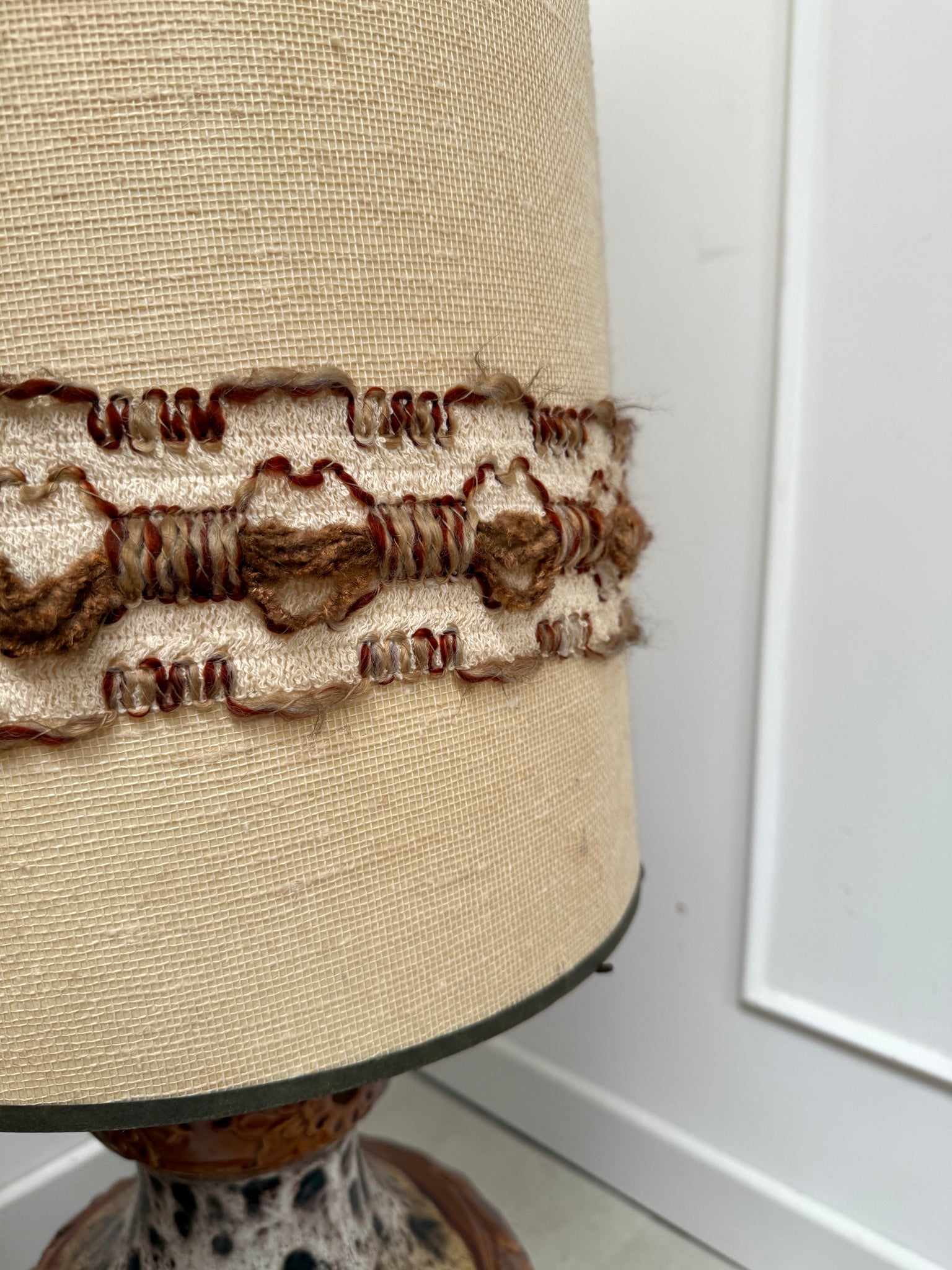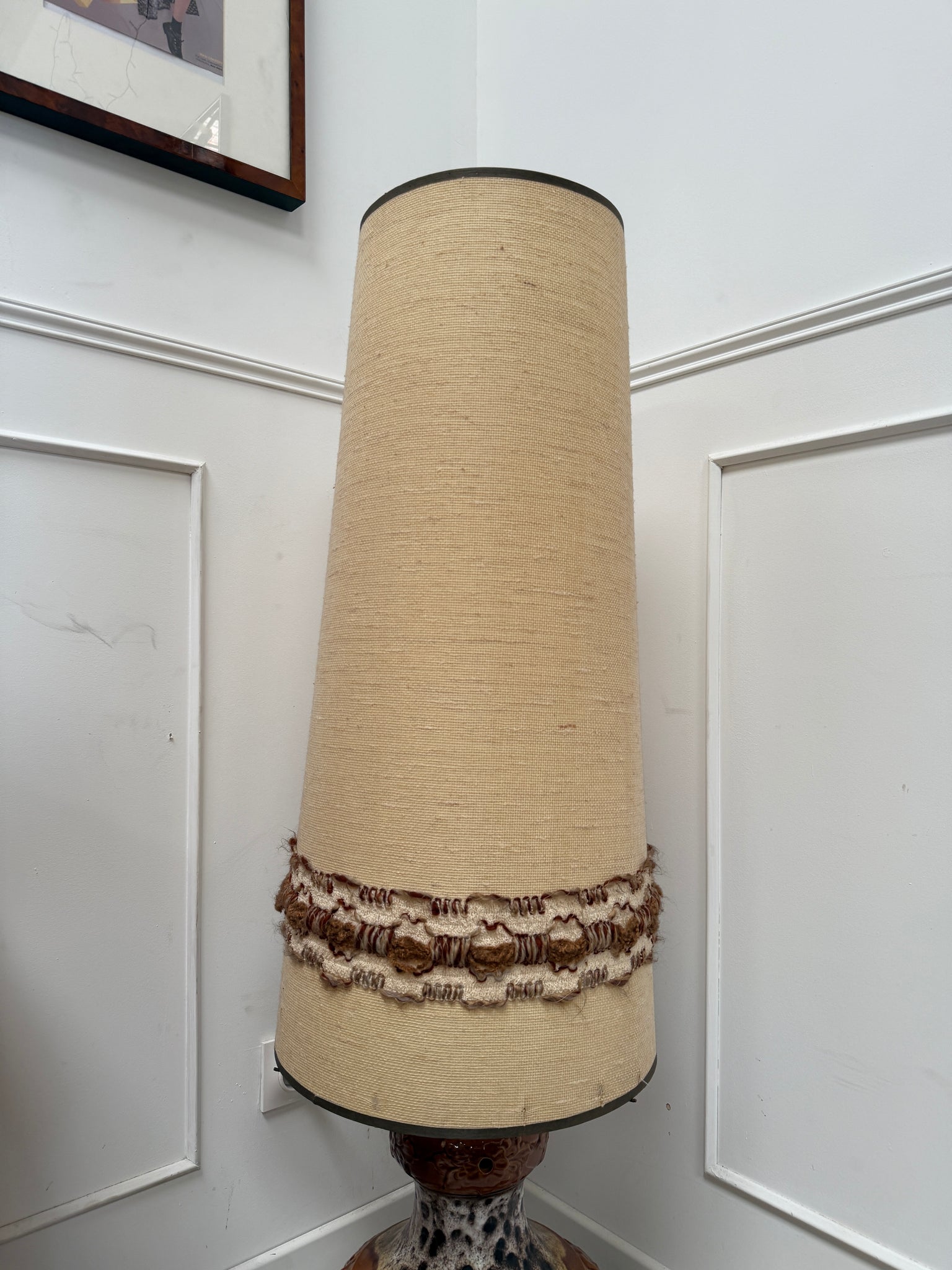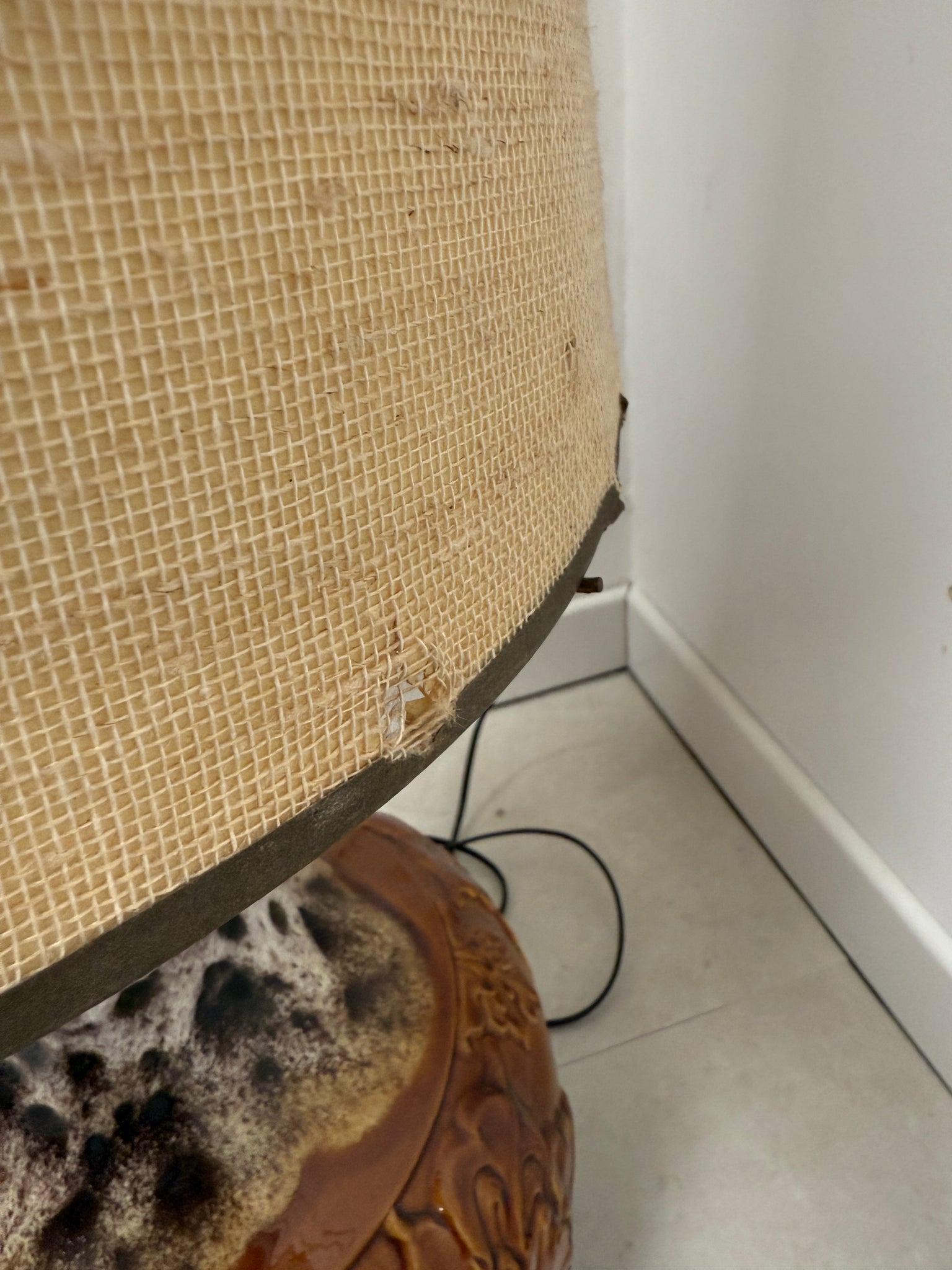 Lampe de sol vintage des années 70 , pied en céramique . Possède un double éclairage : dans le pied et dans l'abat-jour. Abat jour en laine chinée.