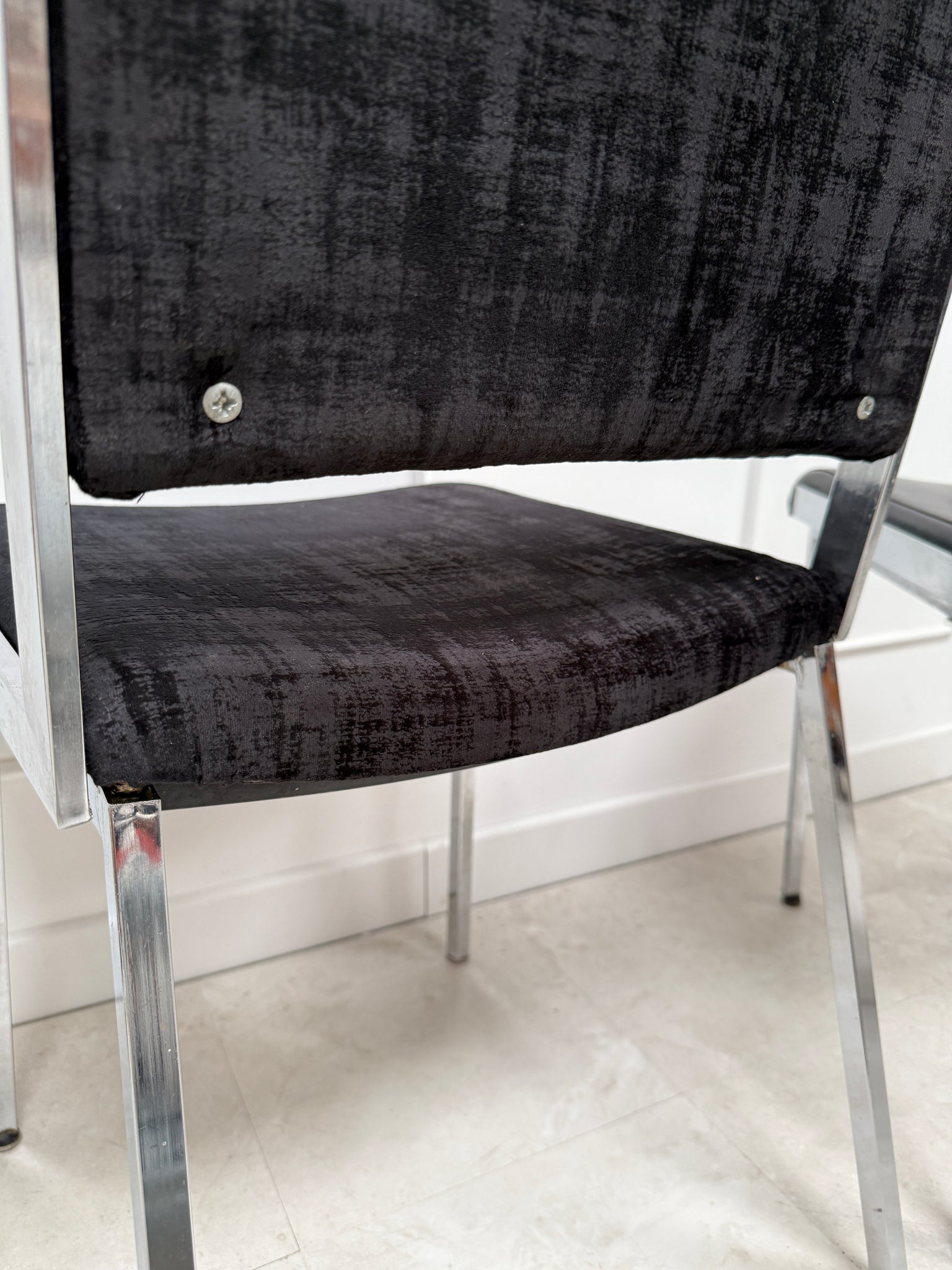 Lot de 5 chaises des années 70 , avec leur structure en métal chromé. Le chrome est en très bel état , bien brillant.