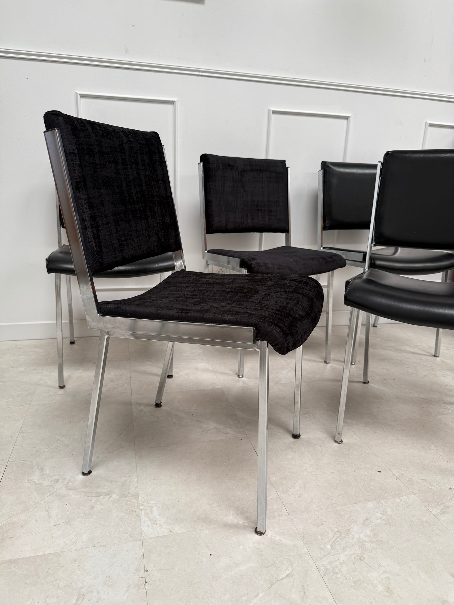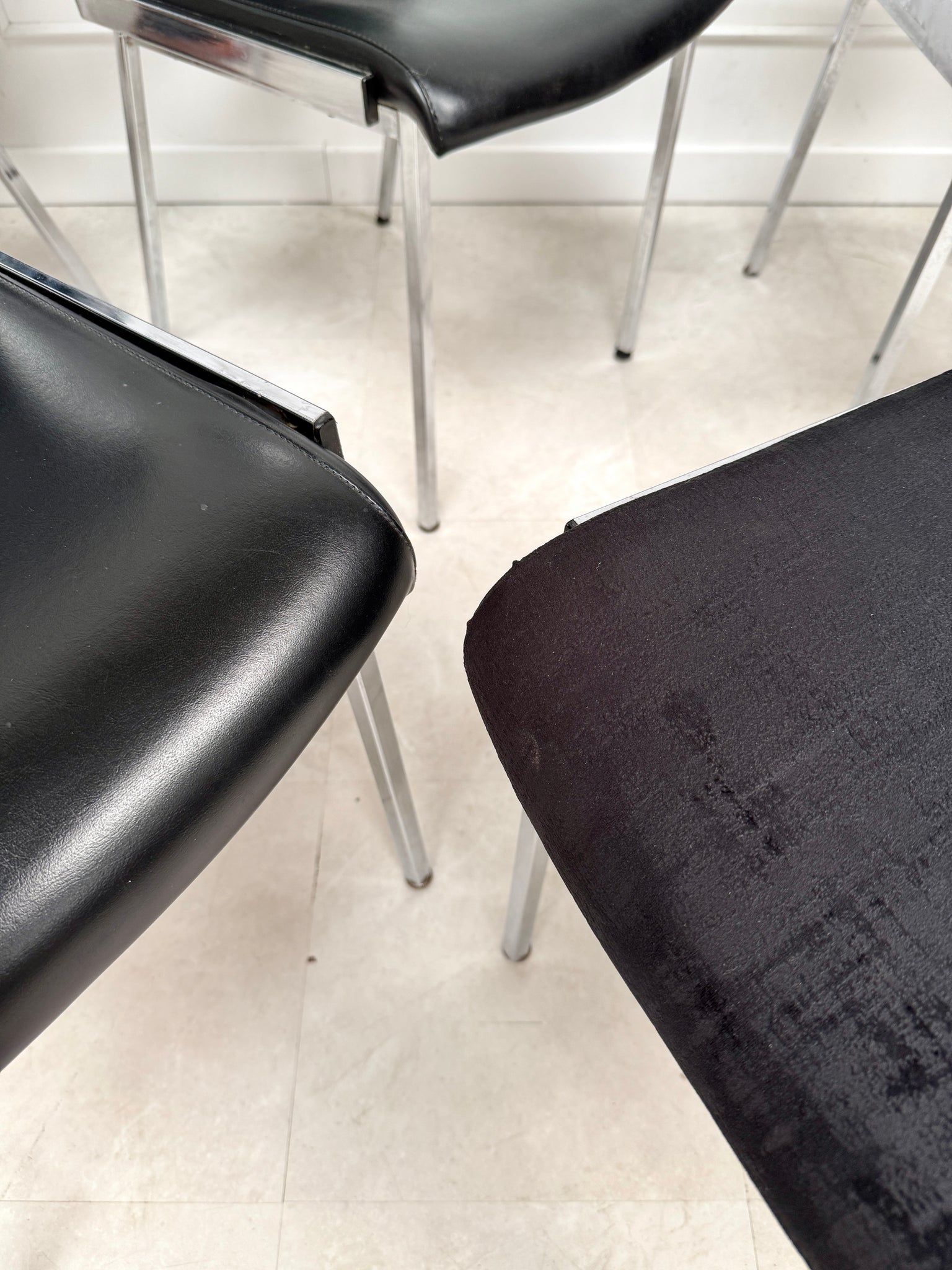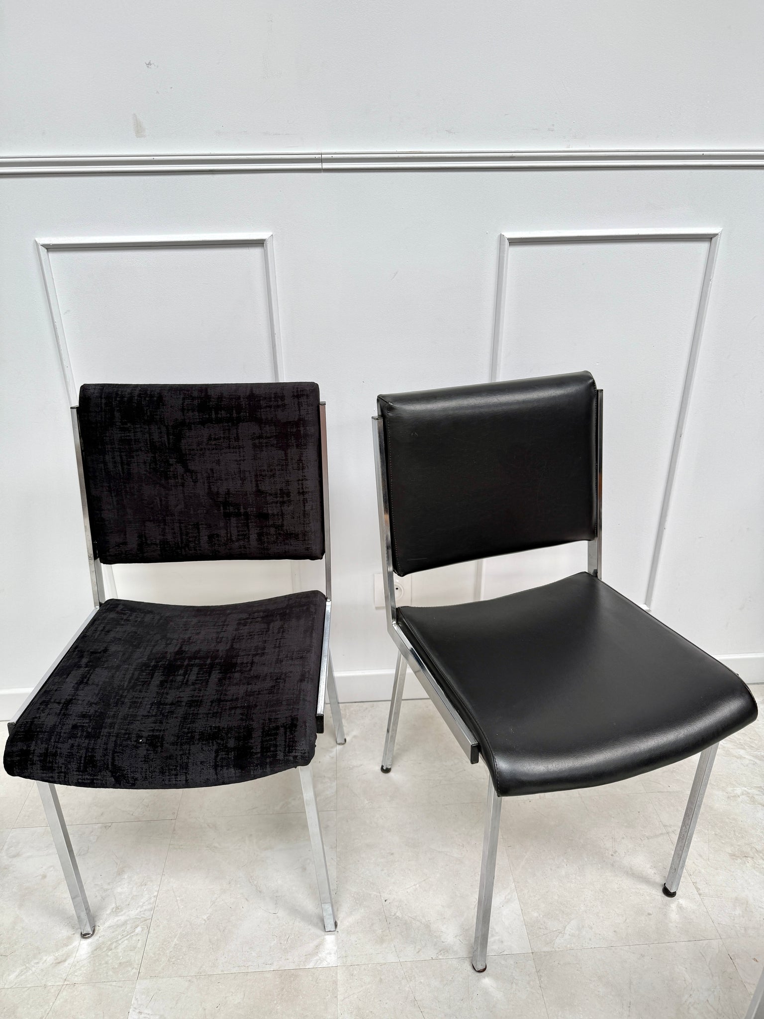 3 chaises avec leur assise en skaï noir et 2 chaises en tissu velour noir. Le tissu est en parfait état, une chaise en skaï présente un discret accroc ( voir la photo)