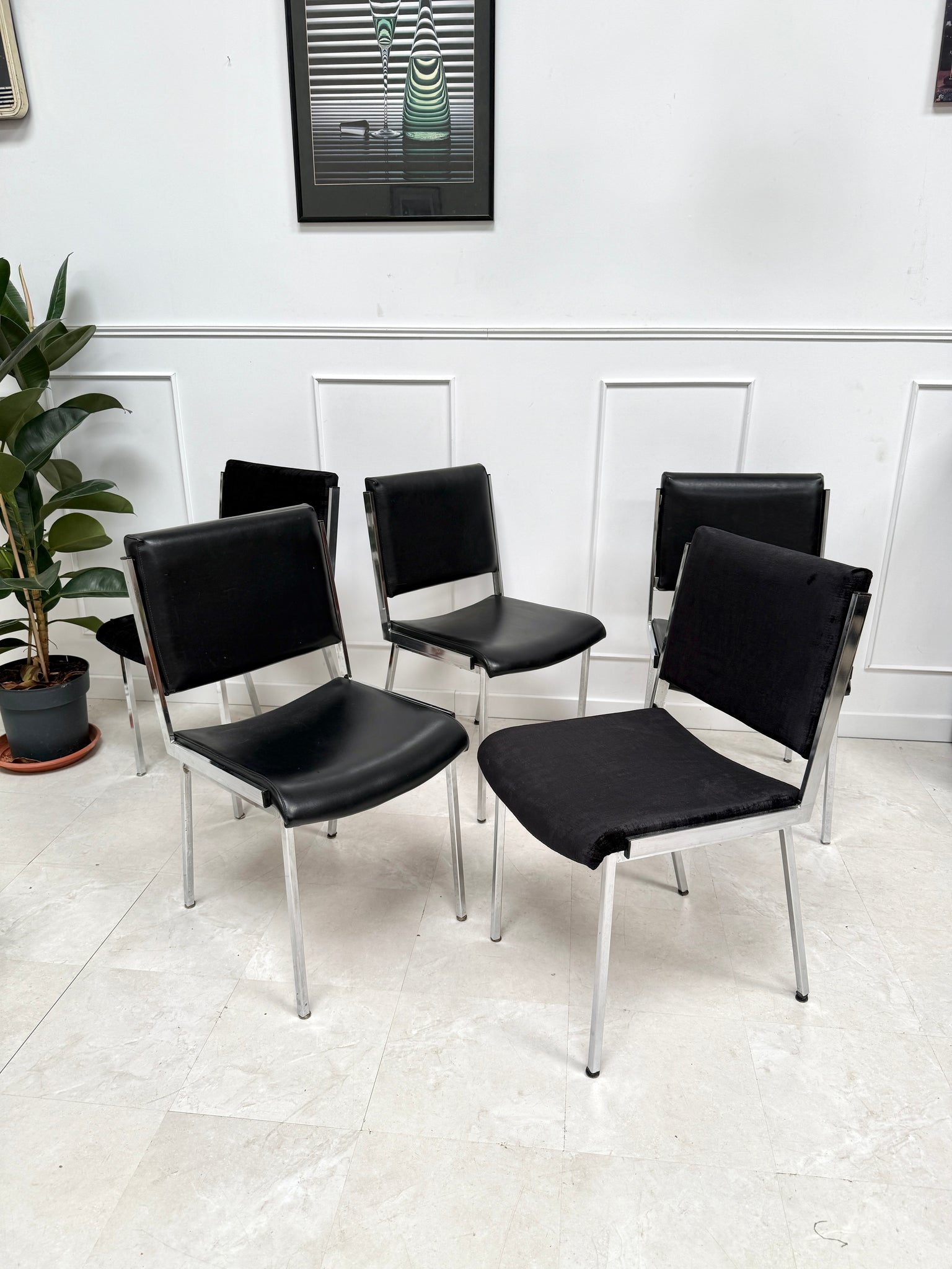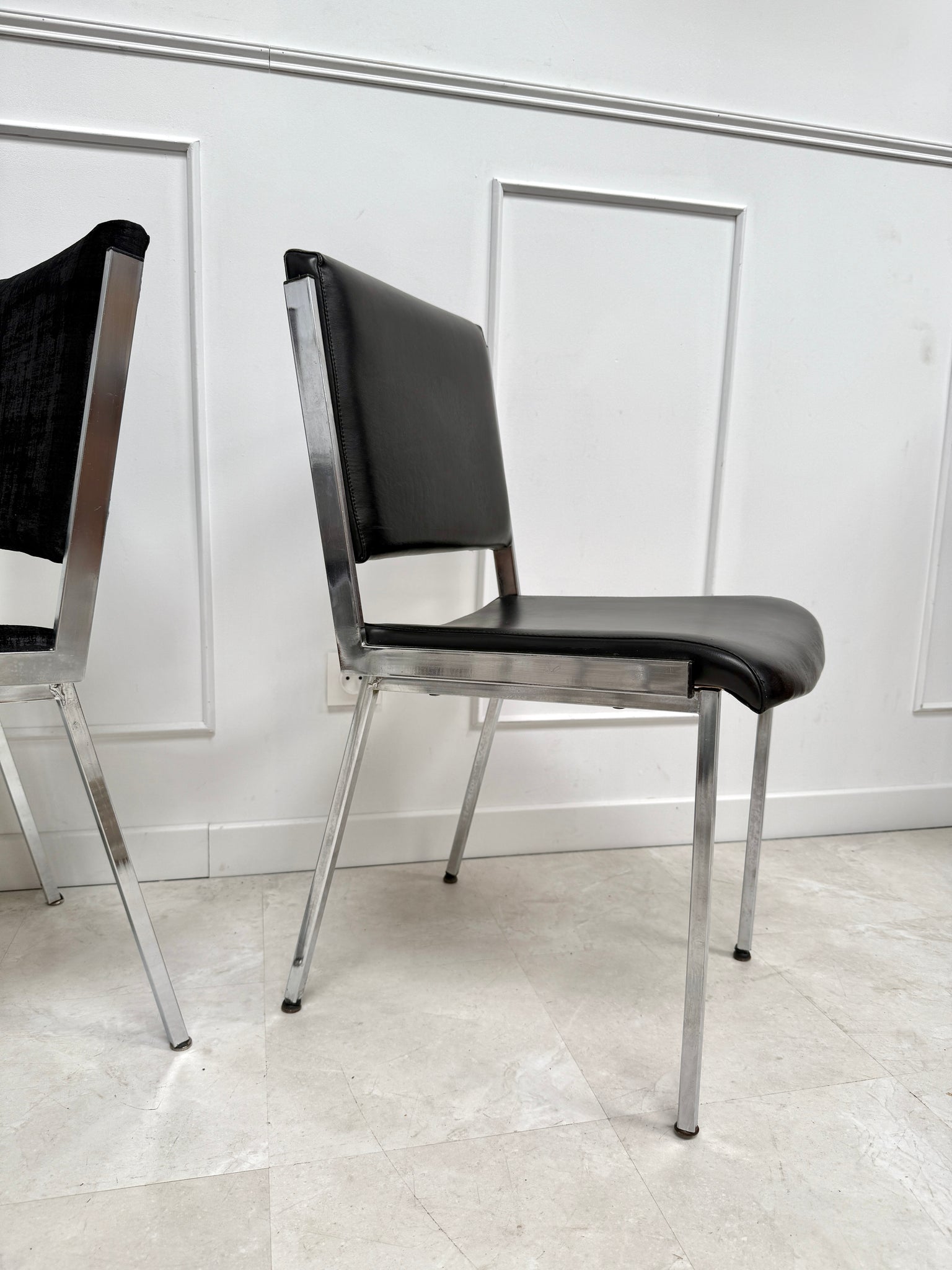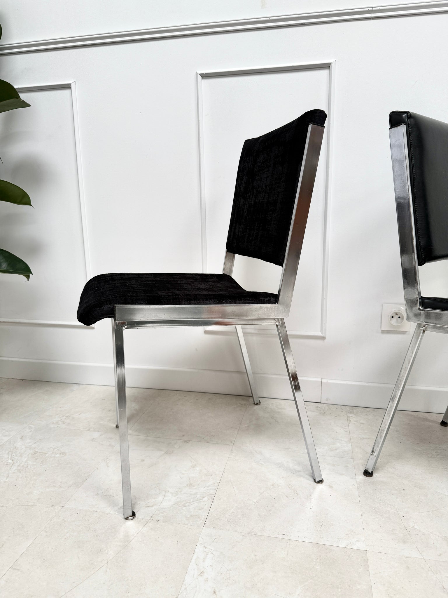 3 chaises avec leur assise en skaï noir et 2 chaises en tissu velour noir. Le tissu est en parfait état, une chaise en skaï présente un discret accroc ( voir la photo)