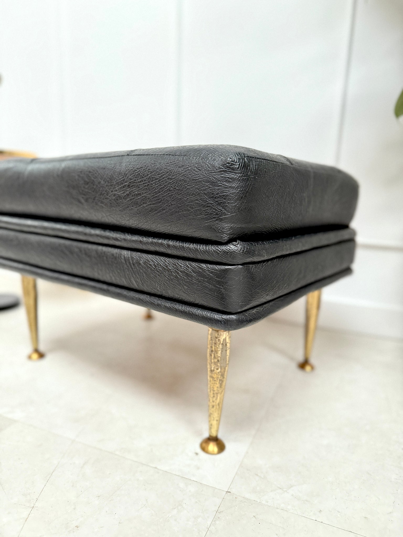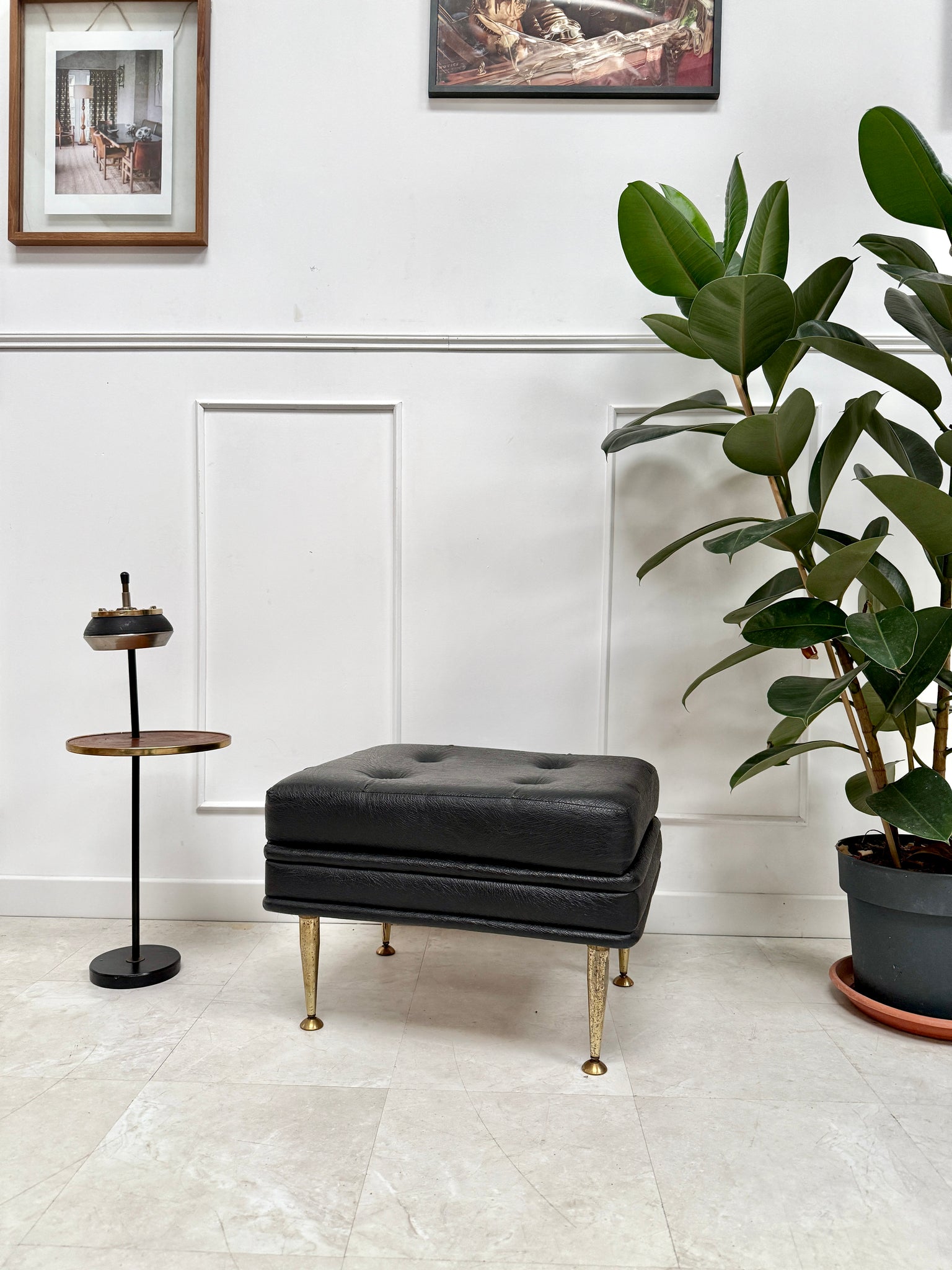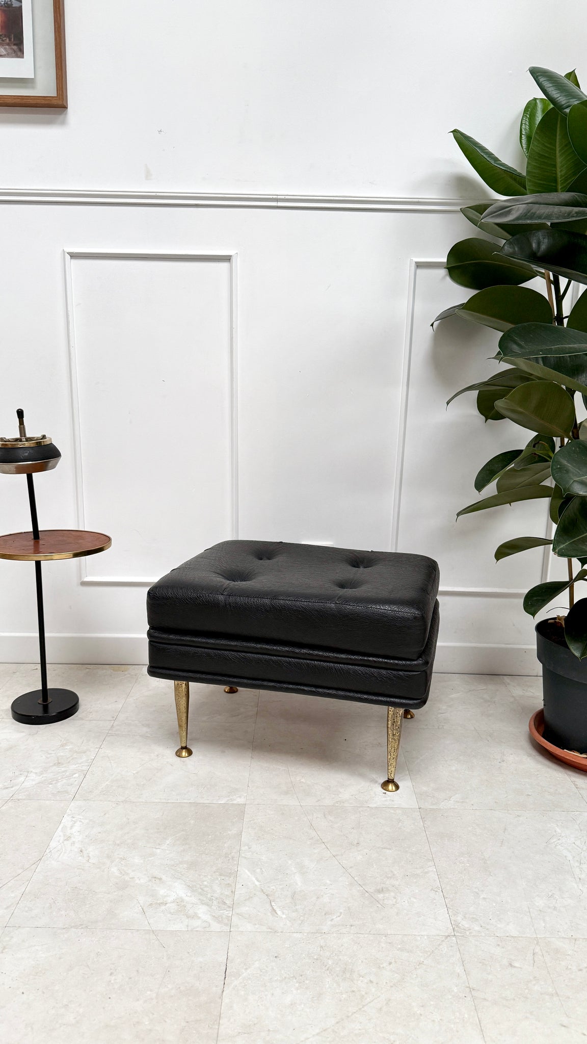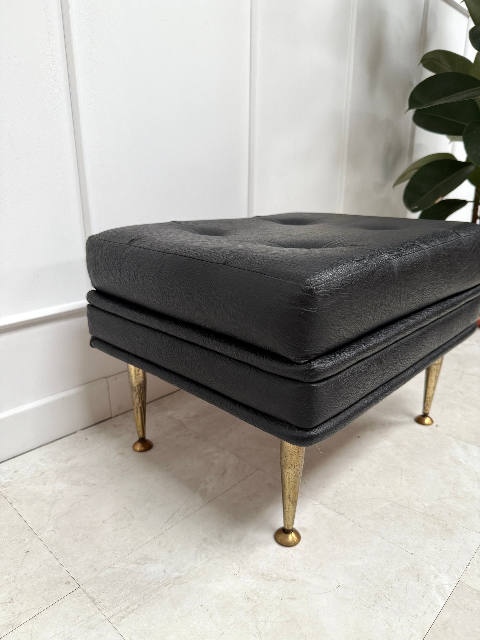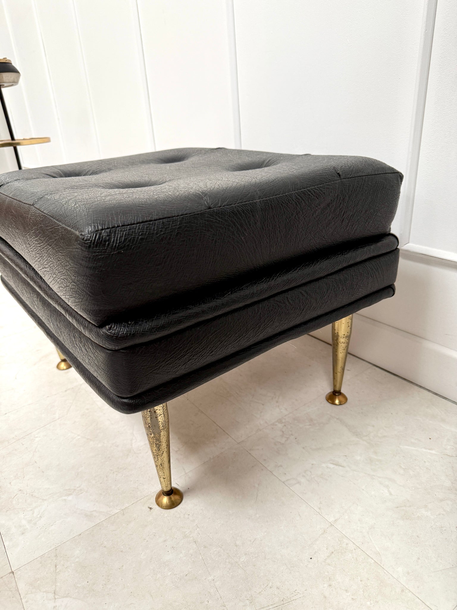Pouf ou repose pieds vintage, en skaï noir et pieds fuseaux en métal doré.