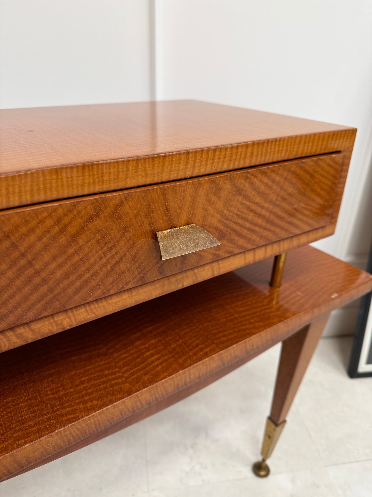 Table de chevet vintage des années 60 . Design original avec son tiroir sur-élevé . Jolies finitions en laiton doré ( poignée, pieds et sur-élévation).